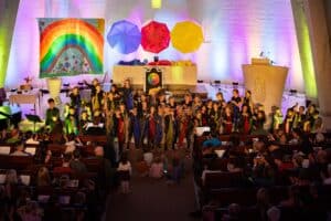 Am Sonntag, den 21.09. wurde die Heilig-Geist-Kirche in das Land „Kunterbunt“ verwandelt, aus dem alle Regenbögen dieser Welt stammen. Im gleichnamigen Kindermusical vermittelten die Lerchen und Füchse der Evangelischen Singakademie unter Leitung ihres Chorleiters Sebastian Möller eine spannende Geschichte, die auf kindgerechte Art die Wichtigkeit von Toleranz, Akzeptanz und Vielfalt innerhalb der Gesellschaft vermittelt.